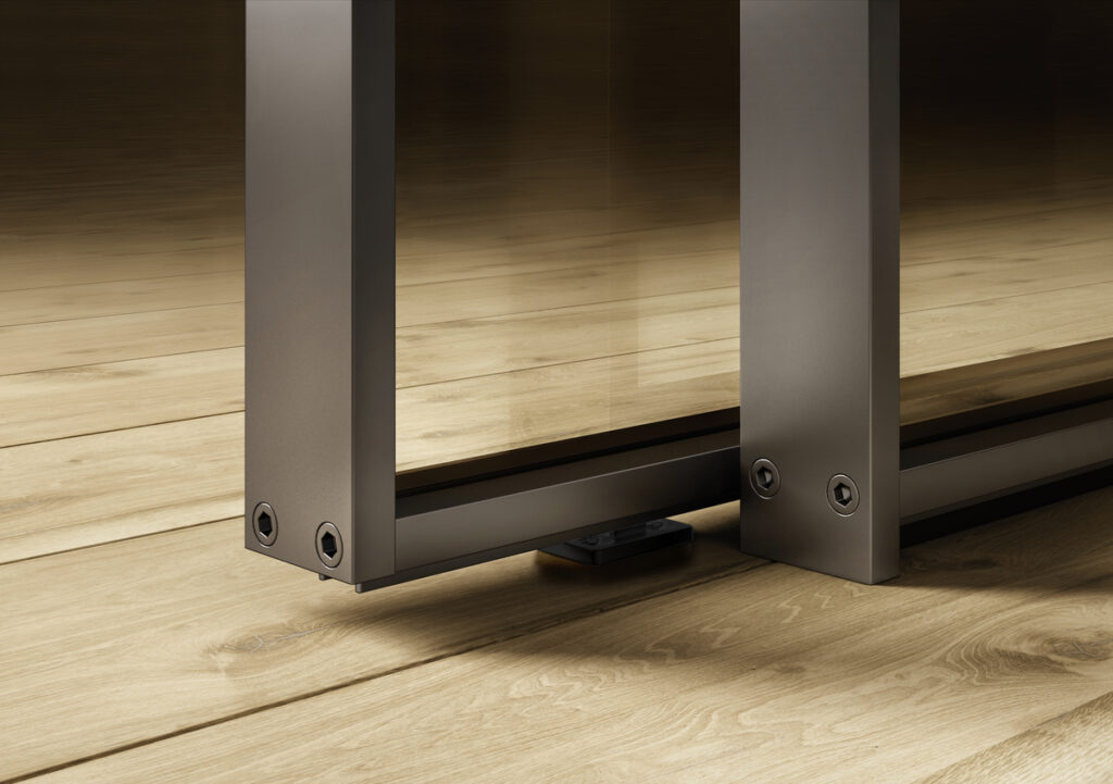 L’alternative au principe de répartition de la charge sur le sol est le système guidé par le plafond (AIR). Il s’agit d’une variante de porte coulissante sans rail au sol, offrant ainsi un accès sans obstacle à toutes les pièces. Afin de ne pas endommager le sol, le rail au plafond de la porte coulissante raumplus AIR supporte le poids de la porte coulissante (60 kg maximum par porte). Seule une ferrure de guidage à peine visible est montée sur le sol ; elle empêche le balancement de la porte coulissante. Une capacité de charge correspondante du plafond doit bien entendu être assurée par le client.