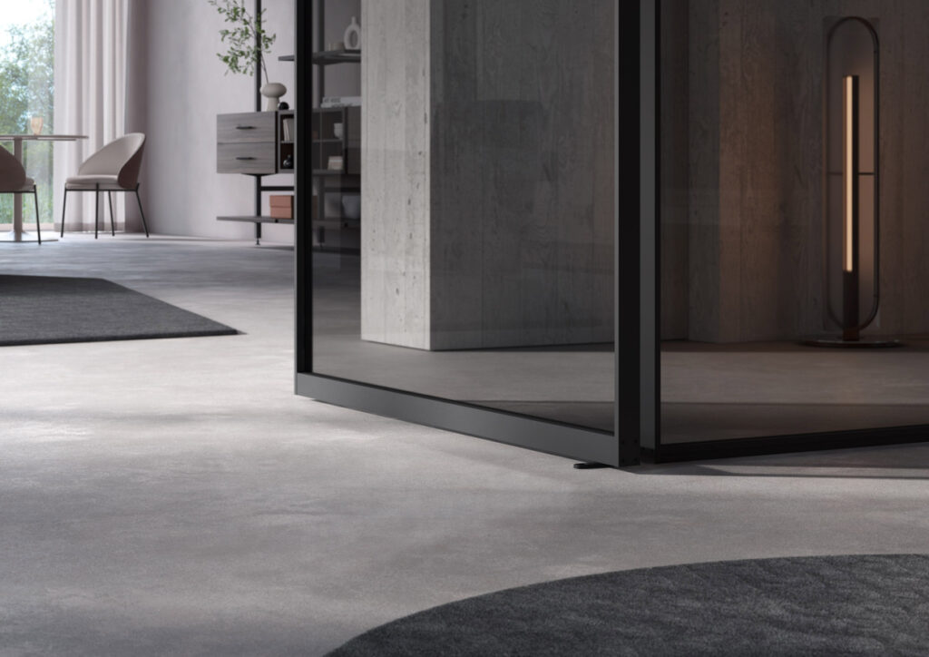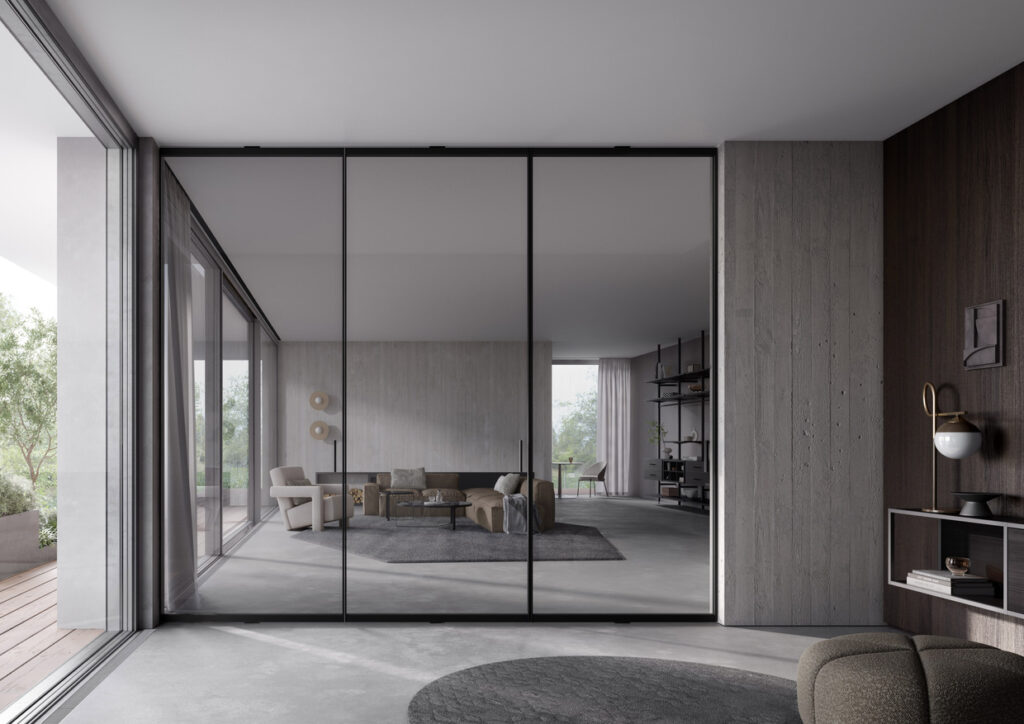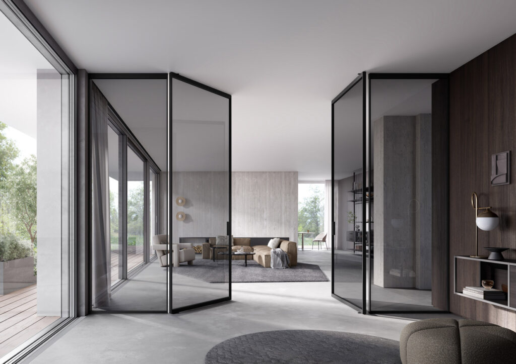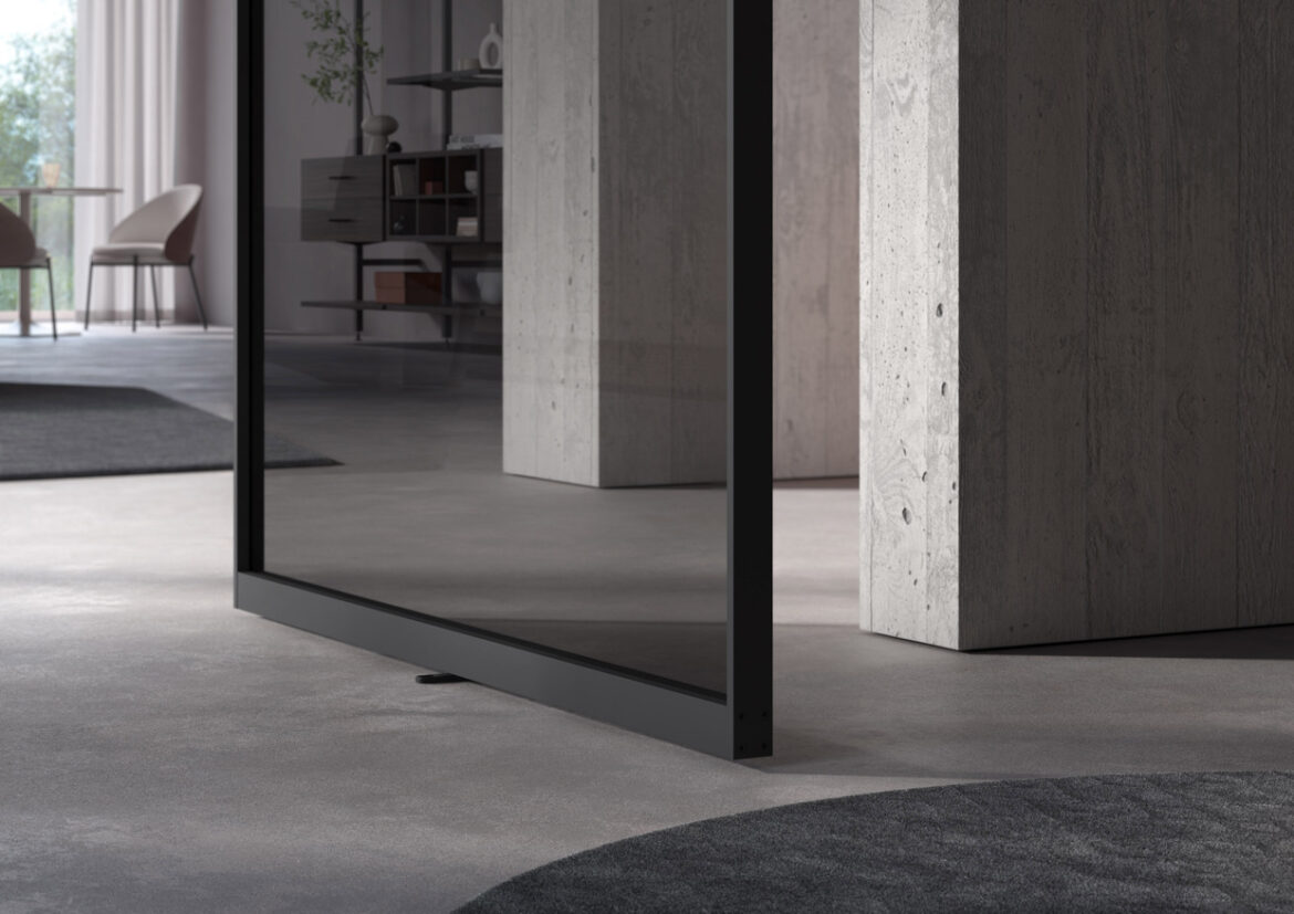 La porte pivot S1200 se compose d’un cadre en aluminium et d’un panneau de porte. La porte pivot S1200 est disponible avec un cadre en aluminium revêtu par poudre en argent ou en noir, laqué selon RAL ou anodisé en argent, en bronze clair ou foncé. Le design particulier de la porte pivot S1200 lui a déjà valu une nomination pour le German Design Award 2025.
