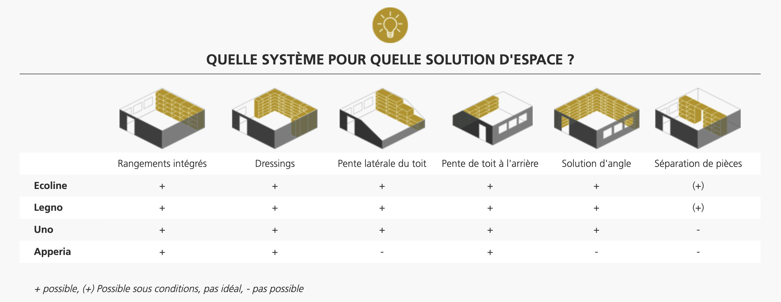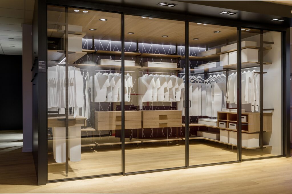 Vous avez le choix entre: Ecoline, Legno, Uno et Apperia. Chacun de ces systèmes de rangement est fabriqué sur mesure. Selon le produit, il s’agit d’une armoire fermée avec des portes battantes, pliantes ou coulissantes. Ou en tant que dressing séparé de la chambre à coucher proprement dite par une porte coulissante.